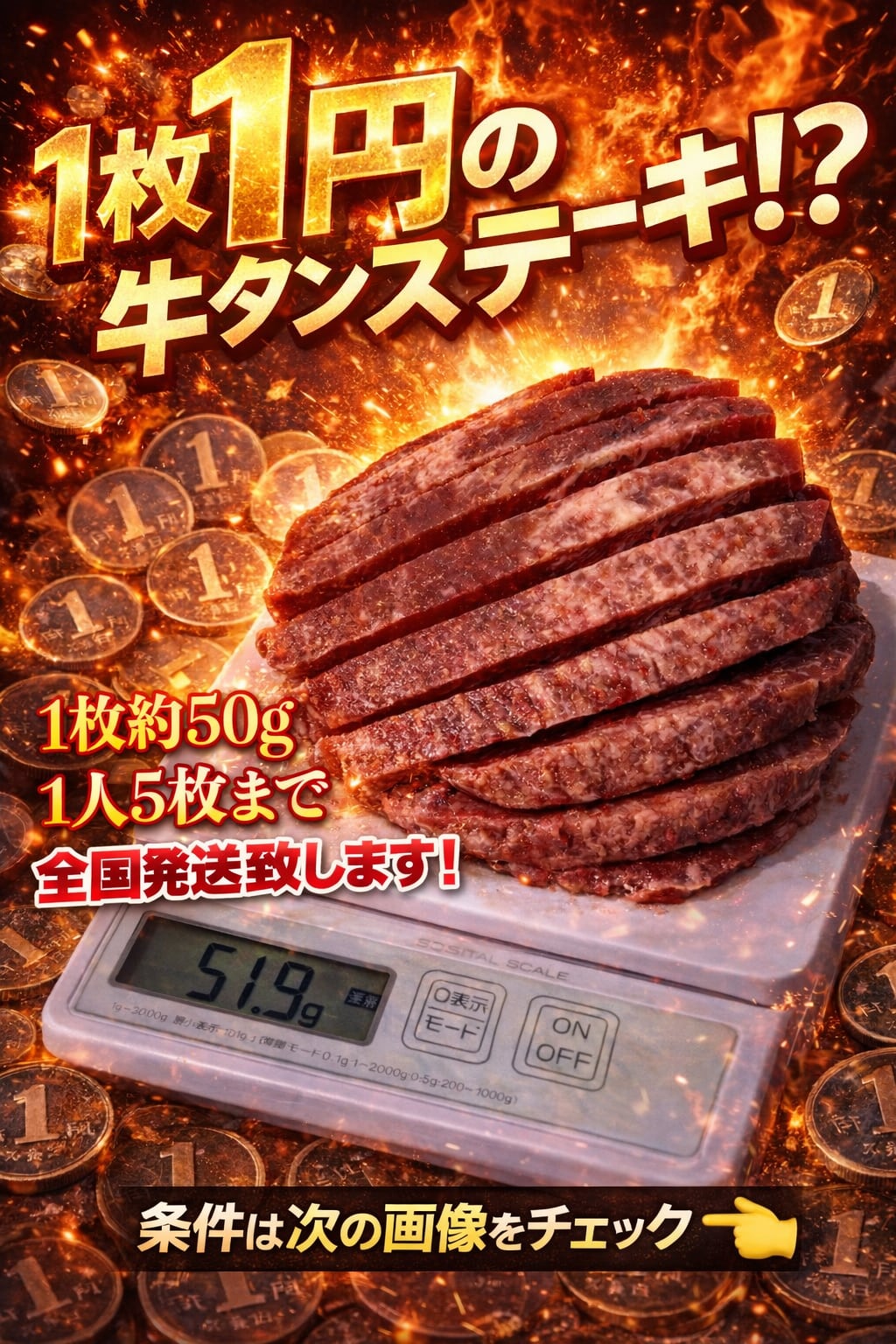 「牛タンステーキ1枚1円」に